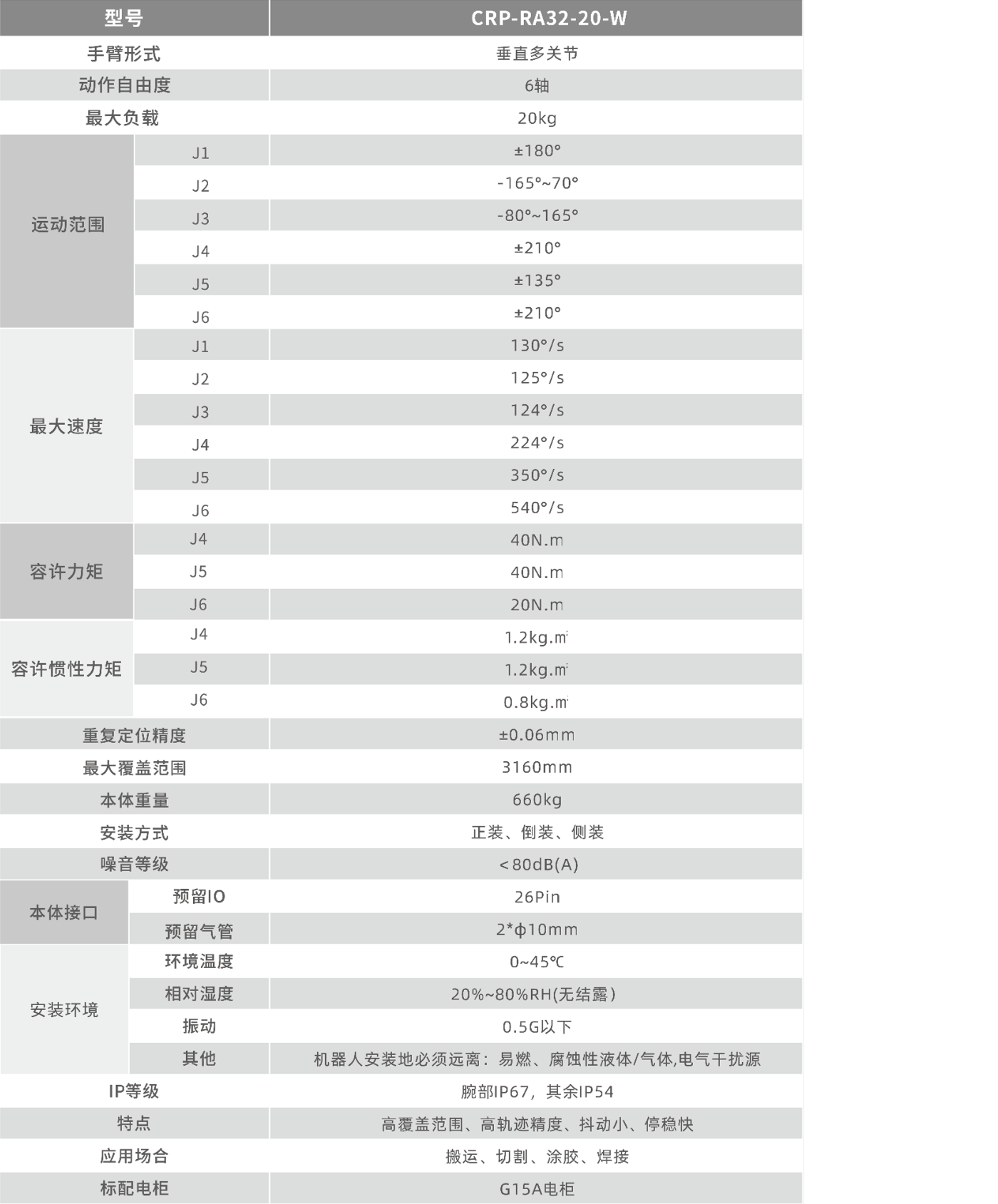 内置电缆、气管,通过小臂和手腕中心处设置中空部分,从机器人基部到腕部末端内置电缆和气管,更大地方便了用户使用,提高了作业效率。